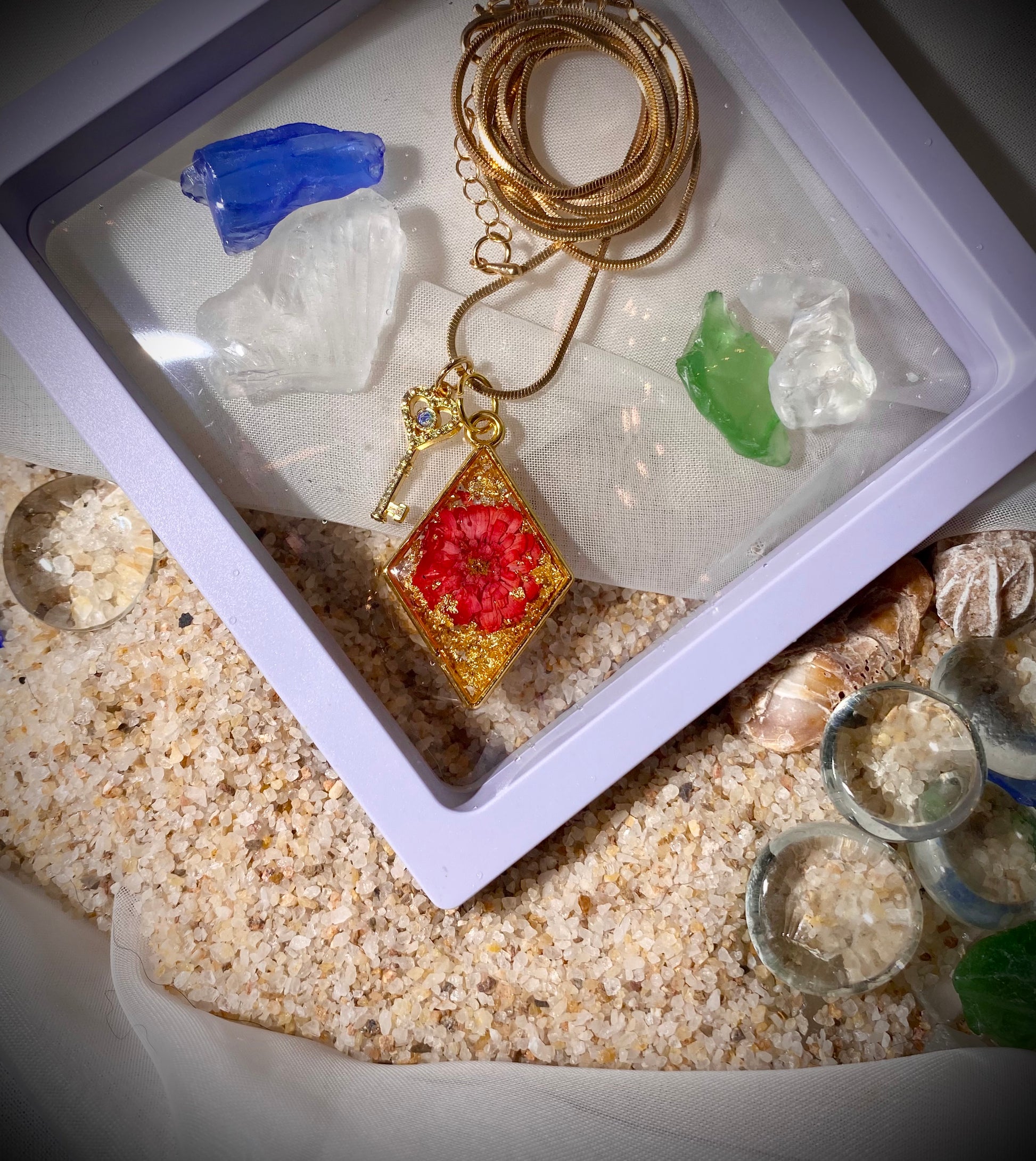 Capture a piece of nature with this exquisite handmade necklace. A real, delicate dried flower is carefully preserved in a crystal-clear, high-quality resin pendant, creating a unique and timeless piece. The natural beauty of the flower is protected within the smooth, durable resin, while the stainless steel chain ensures long-lasting wear. Perfect for nature lovers, this necklace is a beautiful accessory for any occasion, from everyday wear to special events, and makes a thoughtful gift. Case and sea glass included.